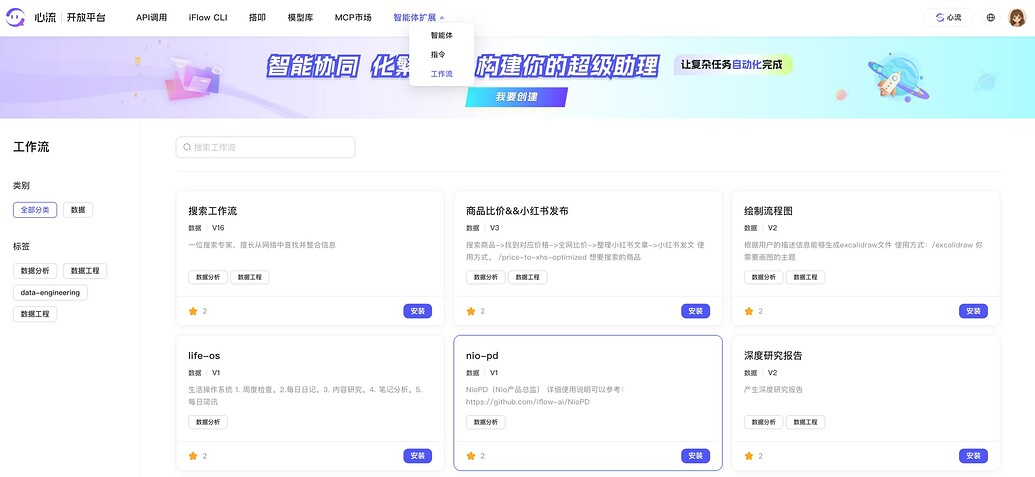 在心流开放平台智能体扩展那里找到NioPD工作流,点击安装,在你的项目环境里面安装