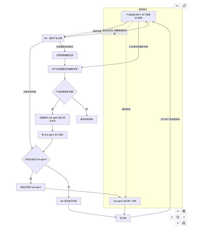 - 主动请求: 产品经理也可以主动向 Nio 请求,要求创建一个符合特定能力描述的新 Sub-agent。