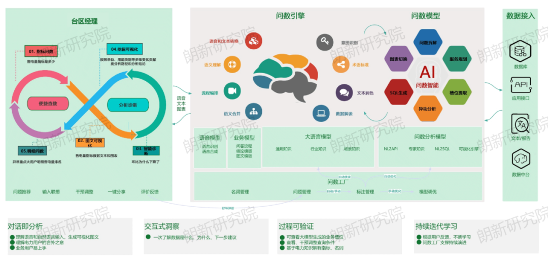 针对上述痛点,数据查询和分析的产品需要方便业务人员更快上手,无需繁琐的需求传递链、无需脚本编码技术要求,直接触达数据;需要支持任意维度数据的探索,快速响应临时报表和看数需求,提高数据查询的作业效率;需要掌握业务语言的语义理解、业务语言到技术语言的生成、数据的分析推理和结论生成等关键路径,而传统的NLP和信息化技术恰恰很难解决用户意图的准确理解、关键逻辑的生成等问题。
