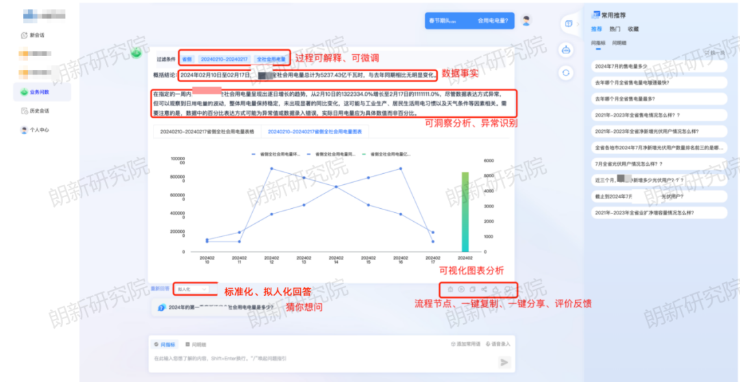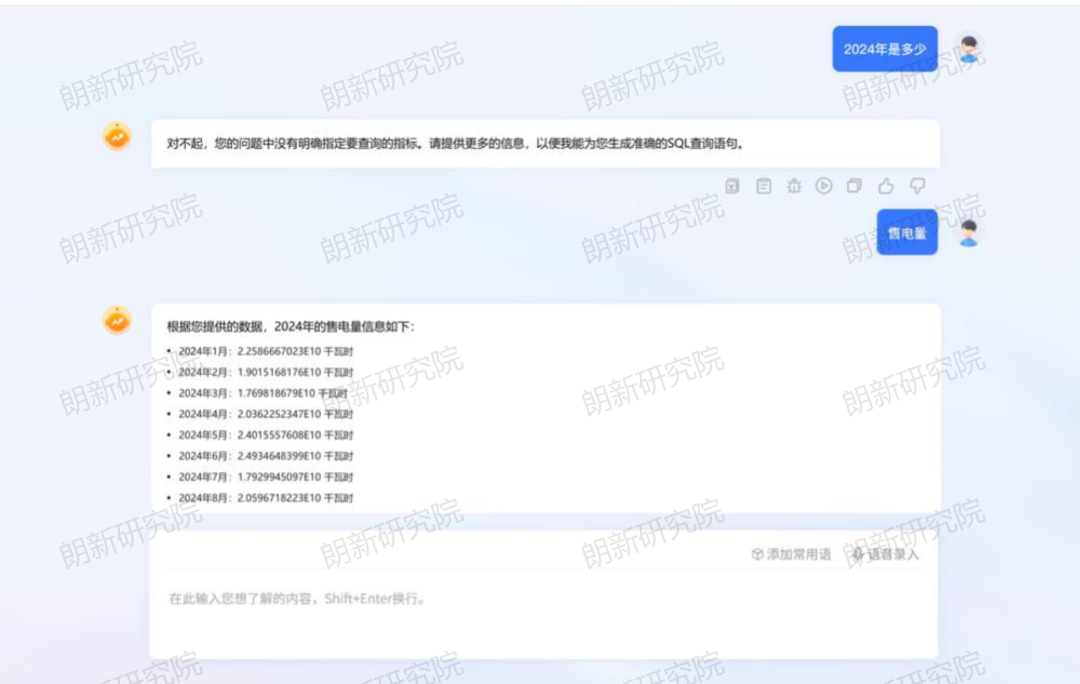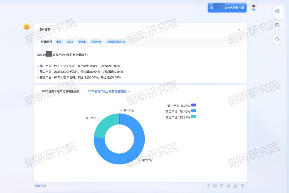 在电力行业,通过自然语言交互对全社会用电量等指标进行提问,使用指标服务规划组件生成指标名称、指标统计周期、组织单位名称、单位层级及指标维度,指标维度包含行业分类、用户分类、用能类别等,从而实现指标数据查询需求转换为易于理解的业务语言。