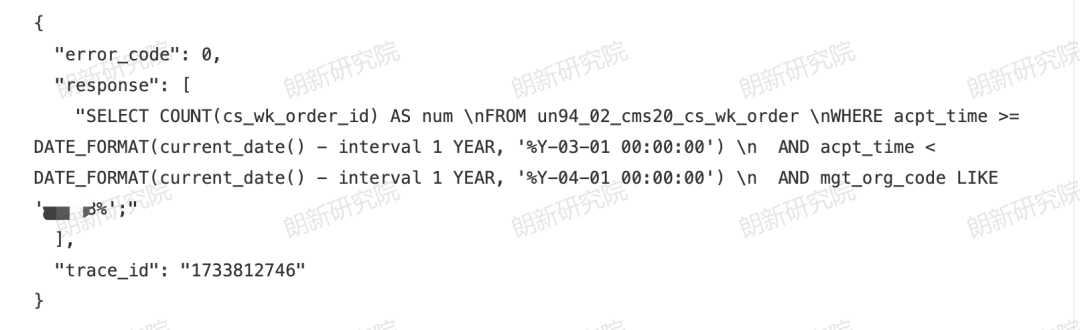 例如,用户改写后的问题是“xx去年三月份有多少工单?”,场景模型会给出SQL信息,如下图: