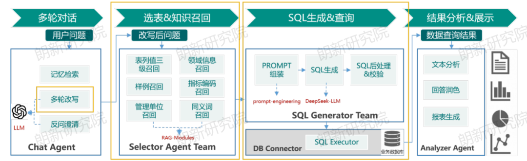 该模块负责通过Prompt Engineering和LLM自动生成高效的SQL查询语句,并确保其可执行性。其中关键功能有: