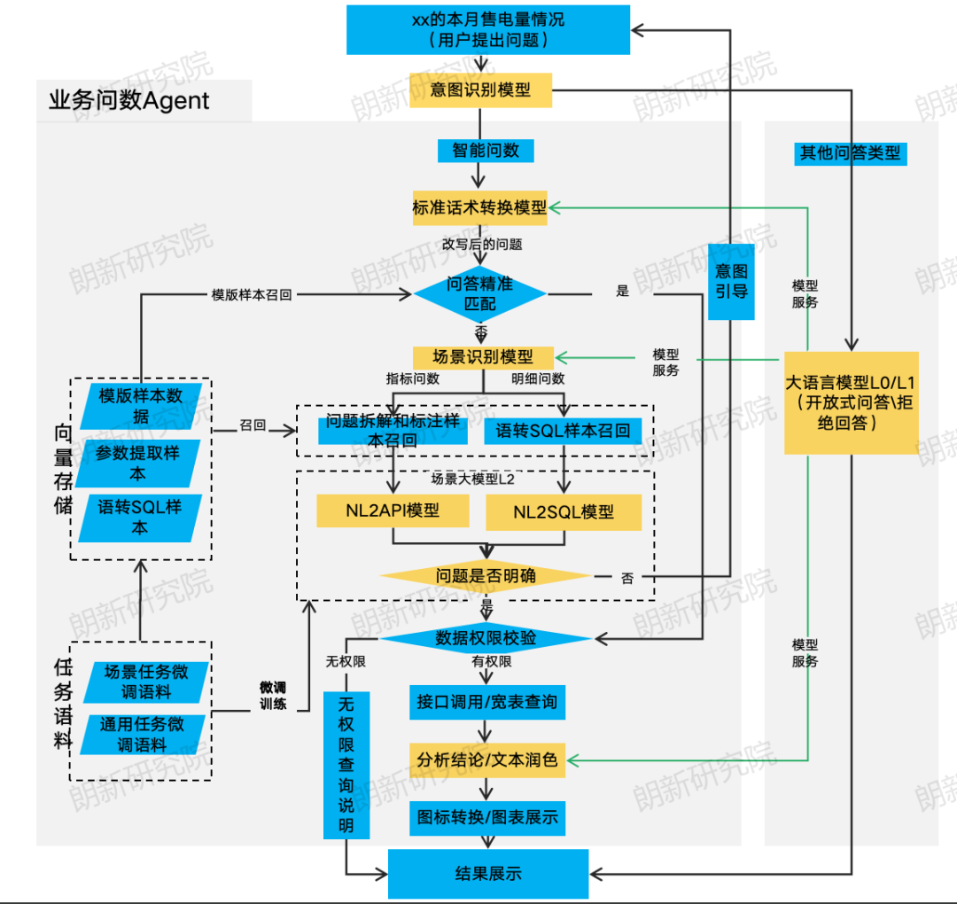 具体设计思路为:用户提出问题,经过意图识别模型判断用户问题意图并分发相应智能体回答,通过标准话术转换模型将原问题转换为标准话术并和向量库存储的模板样本数据进行匹配校验,根据场景识别模型识别问题是指标问数还是明细问数来确定使用NL2API或NL2SQL技术路径,最后通过数据权限校验、接口调用或宽表查询、分析结果及图表展示等环节将回答结果展示给用户。