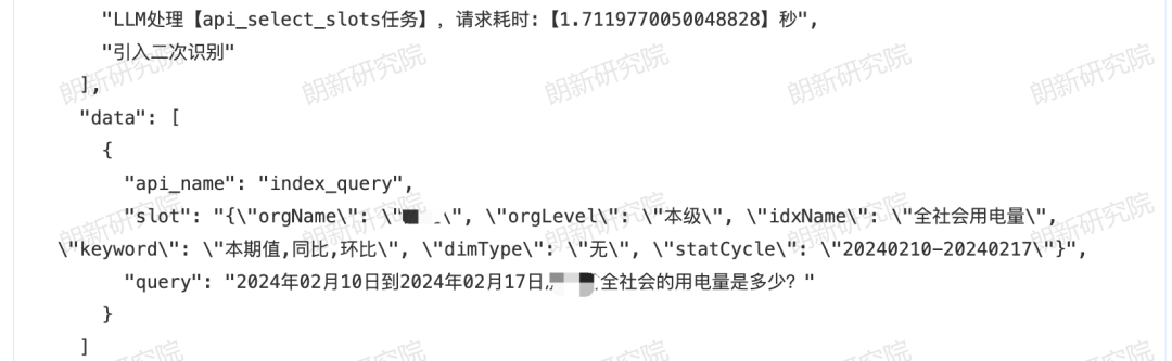 例如,用户改写后的问题是“2024年2月10日到2024年2月17日xxx省全社会的用电量是多少?”,场景模型会给出应该选择使用的服务接口api_name、对应的入参slot和DSL中关键内容,如下图: