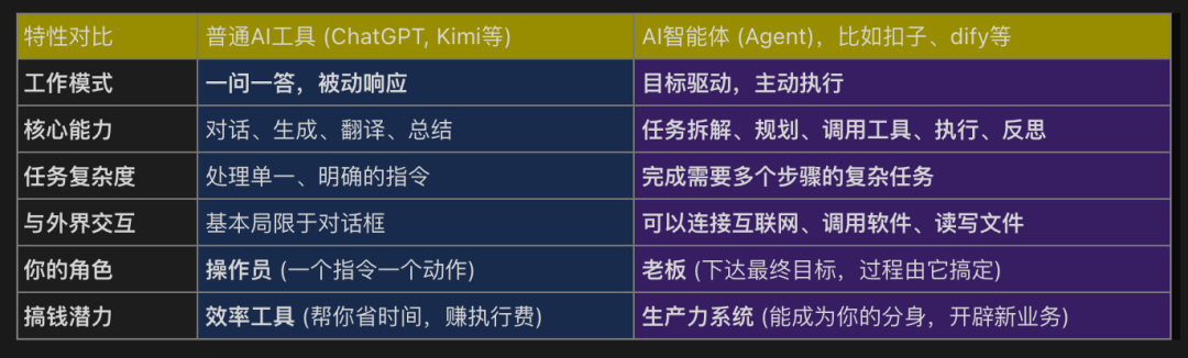 看明白了吗?核心区别在于“自主性”和“任务完成能力”。智能体是“目标导向”的,而普通工具是“指令导向”的。