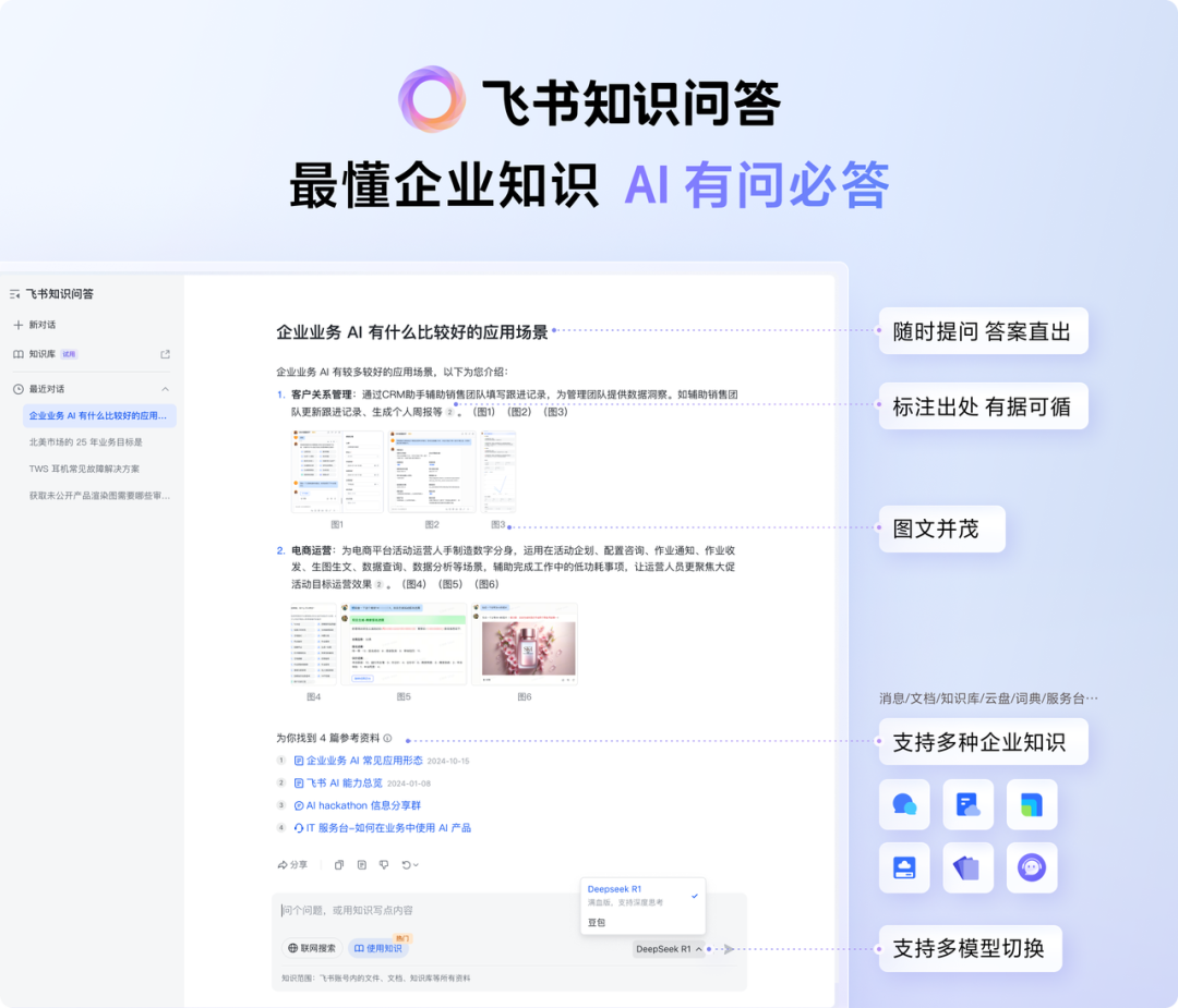 AI带来的范式革命,在于改变了知识管理的底层逻辑,核心又体现在知识触达方式的改变上。过去,需要企业费尽心力建设知识库,希望员工主动去查,但效果往往不佳。而AI带来的改变是颠覆性的:当有了企业统一办公平台后,所有的沟通与创作都能自然沉淀。随后,你可以将知识库“喂”给AI,搭建一个智能问答bot,使知识触达与交互的方式从查询变为对话。