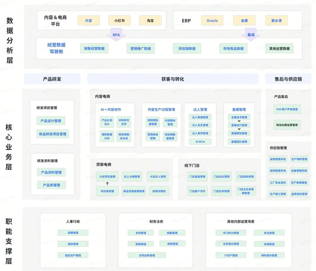 方法二,是构建块状的分领域流程,这个方法则更适合体系成熟的集团企业。当企业发展到一定规模,部门墙林立,协同效率成为新瓶颈,这时就需要更体系化的梳理。它的做法是: 将企业运营按领域进行模块化的划分,如:主业务流(研发、营销-销售-服务、供应链)、使能支撑流(人力资源、财务、法务、IT等)。在此基础上,企业可以拥有一张全局的“业务模块全景图”,从而能够系统性地、有规划地在各个模块的高价值点部署AI,避免形成新的数据孤岛和智能孤岛。
