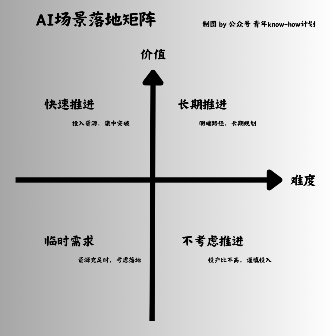 这里有一个常用的方法:用“价值-难度”矩阵选择突破口。我们可以使用一个简单的四象限分析工具,横轴是“实施难度”,纵轴是“业务价值”。企业应优先选择那些“高价值、低难度”的点状场景,力求“Quick Win”(快速制胜)。