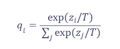 标准蒸馏的核心是软目标(Soft Targets)。教师模型的最终输出经过一个“温度”(Temperature, T)参数调整后的softmax函数处理:
