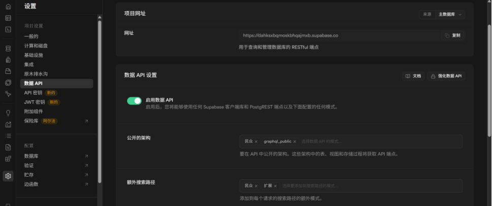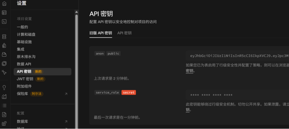 在您的项目设置中,找到 API 页面,您会看到 项目 URL 和 anon 公共密钥。
