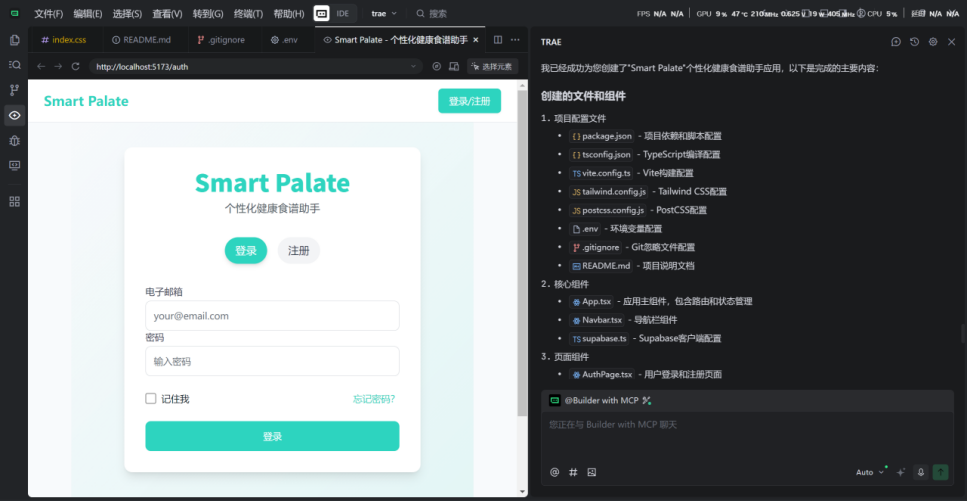 - 操作数据库:通过 MCP 连接到 Supabase,自主创建用户表、食谱表,并进行数据读写。