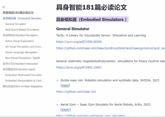 为让大家能够紧跟领域前沿,找到更多idea启发,我给大家准备了181篇必读论文,原文和源码都有。主要涵盖具身机器人、模拟器、具身交互、具身感知、具身智能体等热门方向。