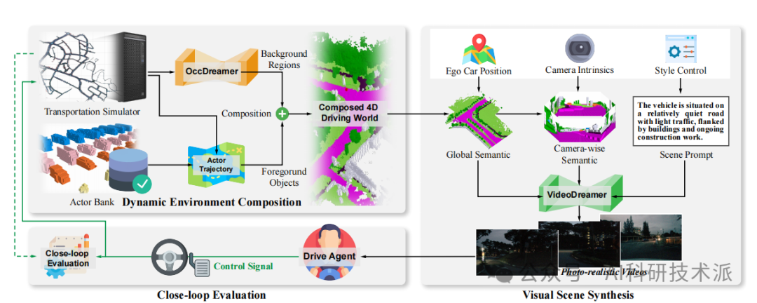 该论文介绍了DrivingSphere,这是一个用于自动驾驶闭环仿真测试的高保真4D世界构建框架。它通过动态环境组合模块生成包含静态背景和动态对象的4D驾驶世界,并利用视觉场景合成模块将其转化为高保真、多视角的视频输出,确保时空一致性。