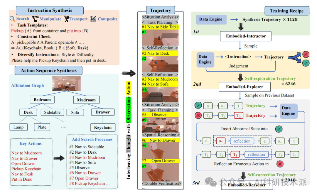 该论文介绍了一个名为Embodied Reasoner的模型,它将视觉搜索、推理和行动相结合,用于交互式任务。该模型通过模仿学习、自我探索和自我修正的三阶段训练流程,利用合成的轨迹进行训练,这些轨迹包含64k交互图像和90k多样的思维过程。