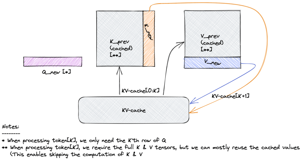 如上图:新 token 只需计算其 Q,并用缓存的过去 K 和 V。缓存后,跳过过去 K 和 V 的计算