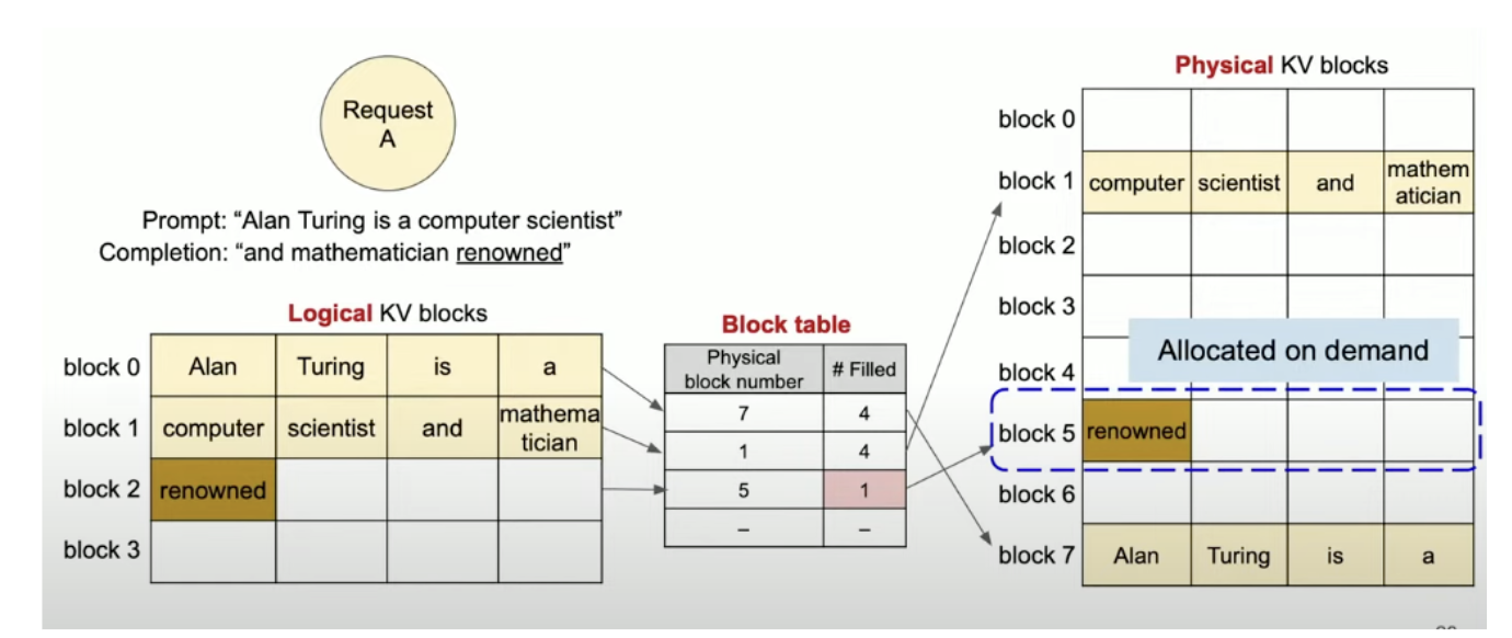 - 分页在PagedAttention中的应用:KV cache被分成固定大小的“块”(blocks),每个块存储一定数量的token的Key和Value。这些块不需要连续存储在GPU内存中,而是分散的,按需分配。