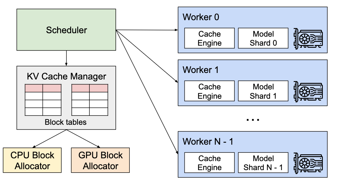 如上图所示,KV Cache Manager 从 CPU/GPU 分配器动态获取块,块表记录映射。没有提前预分所有块。
