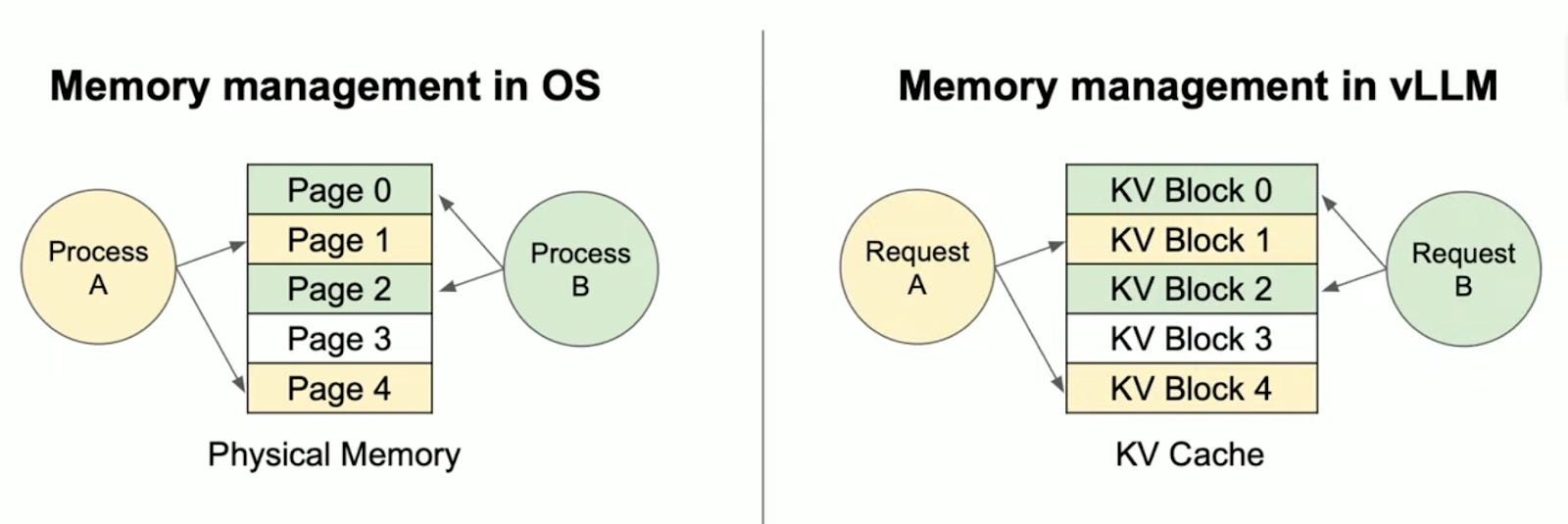 如图,左边 OS:进程 A 和 B 共享物理内存页。右边类似:请求 A 和 B 共享 KV 块。