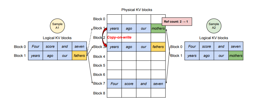 如上图所示,逻辑 KV 块通过 CoW 共享物理块。当 ref count >1 且需要写时,复制新块(见绿色部分)。