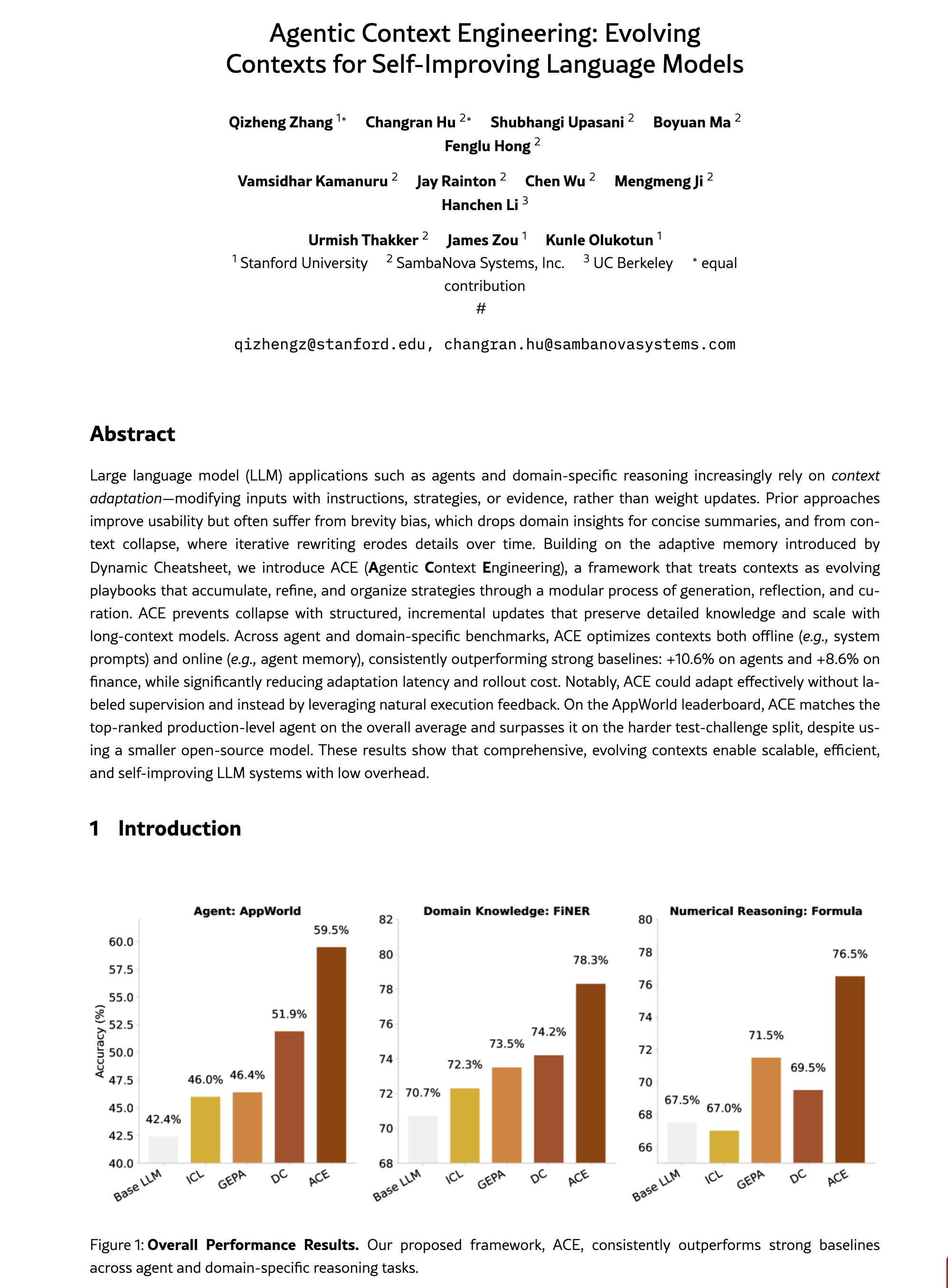 TL;DR: A team of researchers from Stanford University, SambaNova Systems and UC Berkeley introduce ACE framework that improves LLM performance by editing and growing the input context instead of updating model weights. Context is treated as a living “playbook” maintained by three roles—Generator, Reflector, Curator—with small delta items merged incrementally to avoid brevity bias and context collapse. Reported gains: +10.6% on AppWorld agent tasks, +8.6% on finance reasoning, and ~86.9% average latency reduction vs strong context-adaptation baselines. On the AppWorld leaderboard snapshot (Sept 20, 2025), ReAct+ACE (59.4%) ≈ IBM CUGA (60.3%, GPT-4.1) while using DeepSeek-V3.1.