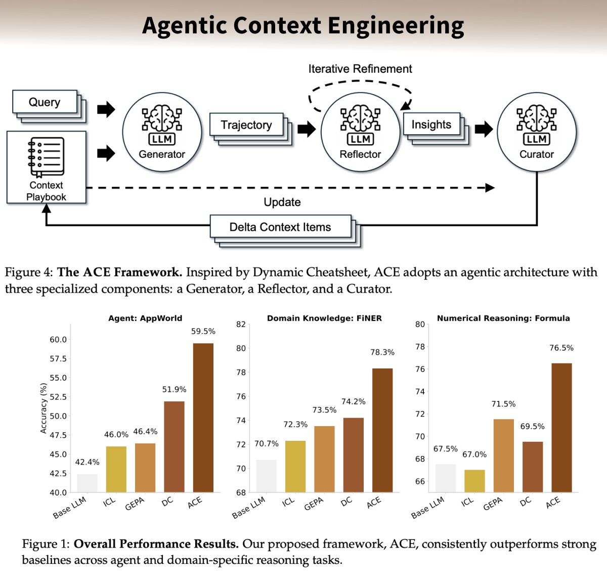 ACE会是下一代情境工程技术吗?ACE(Agentic Context Engineering,自主情境工程)作为一种新型框架,通过将情境视为一个不断进化的结构化知识累积空间,其表现超越了当前最先进的优化器(如GEPA)。