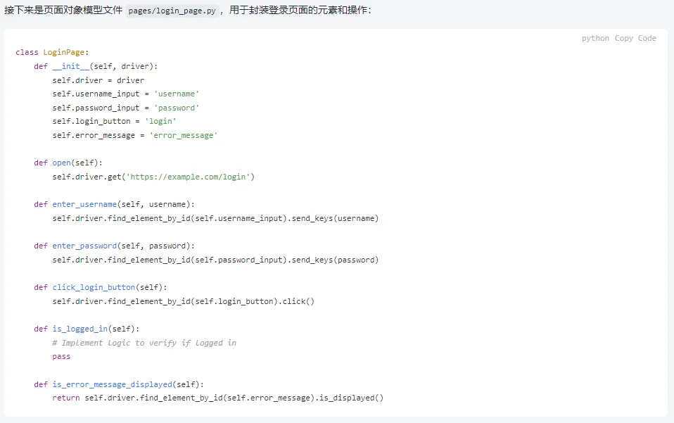 然后,ChatGPT 就为提示内容生成了完整的登录页面自动化测试框架。我们将生成结果分为三个部分来查看。