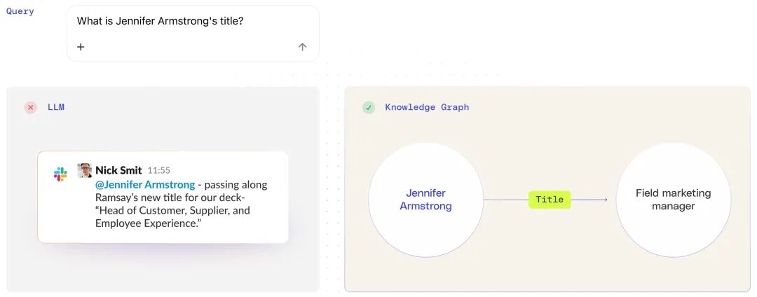 在企业环境中,LLM经常在精确性方面出现问题,过度权衡术语的接近性。例如,一个虚构用户Jennifer Armstrong,现场营销经理,在最近的查询中被错误识别为客户供应商和员工体验负责人。追溯问题源头,LLM误解了她组织的一个活动的Slack消息,给她分配了错误的头衔 。