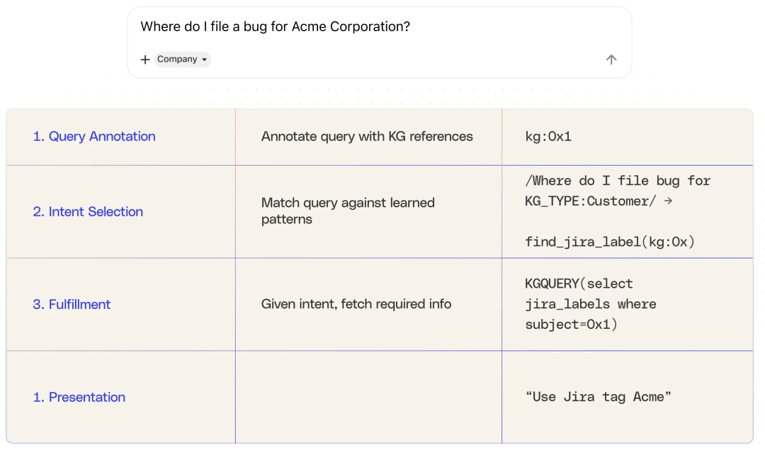 随着大语言模型(LLM)的引入,前两个阶段——实体注释和意图识别——变得更加强大和自动化。LLM擅长解析自然语言,减少了手动模式创建和基于规则的消歧需求。在Glean,我们借助LLM将图扩展到支持数千个边 。