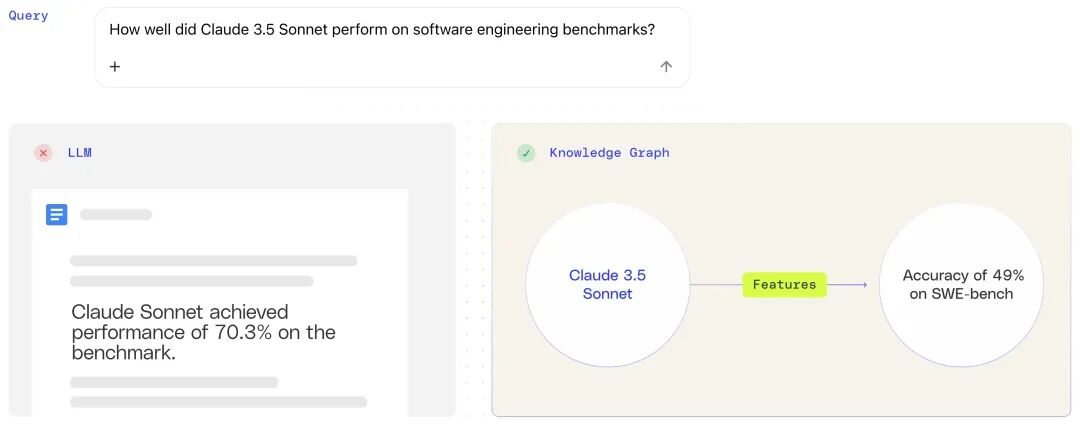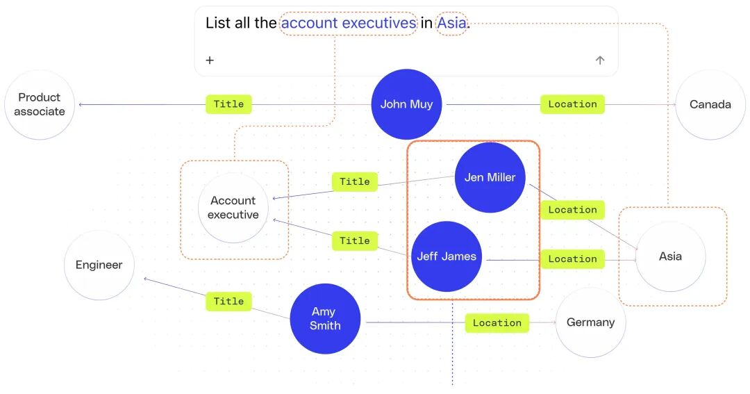 知识图谱通过将查询基于已知的结构化实体来帮助缓解这些问题。当被问及"列出亚洲的所有客户经理"时,知识图谱可以将查询术语"客户经理"识别为特定的工作角色,而不是一般描述,将"亚洲"识别为位置。有了这些信息,系统就可以对所有在亚洲有客户经理角色和位置的员工执行详尽的、确定性的结构化查询。这是仅凭LLM难以始终如一地做到的 。