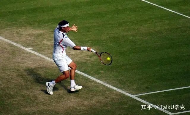 微调前:一位穿着白色运动服的人正在打网球。他站在网球场上,手持红色球拍准备击打球。背景是绿色的草地。未检测到网球拍。