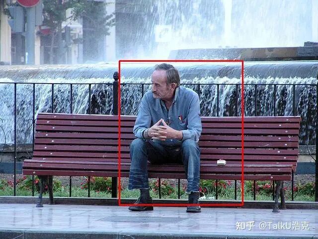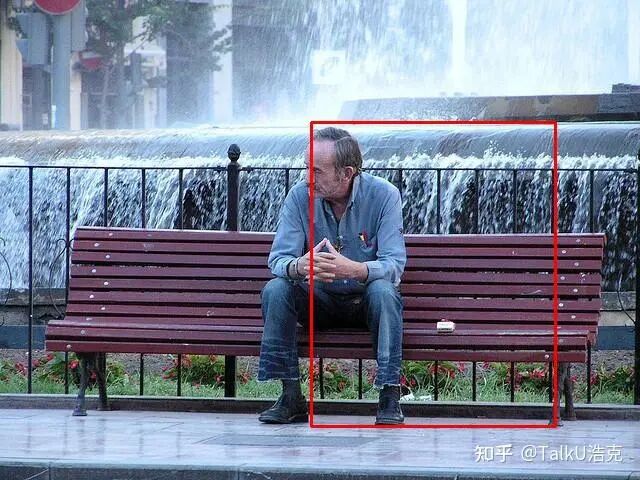 微调前:一位老人坐在公园长椅上,背景是喷泉。周围有红色的长椅和黑色栏杆围成的小区域。<box>[{"box":[486,256,868,888],"label":"男人"}]</box>
