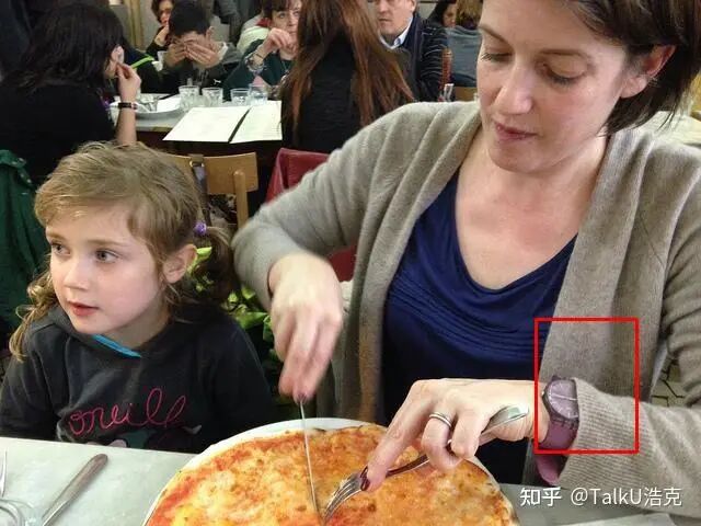 微调前:一位女士正在为一个小女孩切披萨。背景中可以看到其他顾客在用餐。<box>[{"box":[959,657,1090,802],"label":"手表"}]</box>;