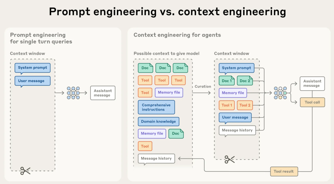 因此,要想实现完整的Agent功能,在传递给LLM的信息中,除了System prompt,user message之外,还要包括Docs(领域知识,工作对象等),工作记忆(Message history)等。把这些内容都汇总起来就是LLM需要的Context(上下文),而这个汇总(精炼、压缩)的工作就叫Context Engineering (https://www.anthropic.com/engineering/effective-context-engineering-for-ai-agents)。