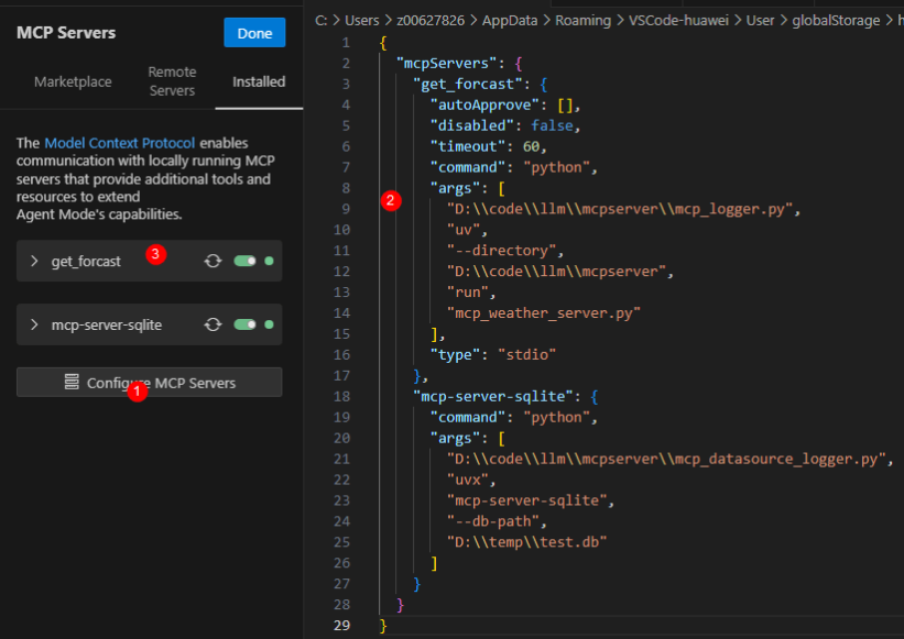 3)当看到配置界面的get_forcast工具为绿色时,表示MCP Server已经配置并启动成功了