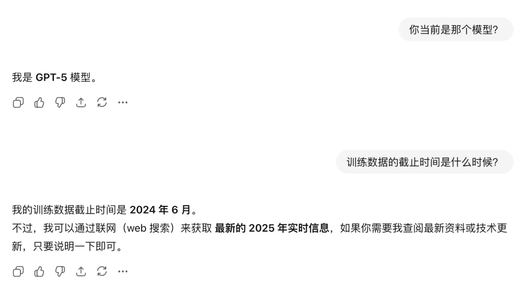 但是,这个大模型有一个问题,它只能知道过去已经发生的时候,在上面也提到了,它是基于过去的所有知识训练、学习出来的,所以,它的知识内容啊,是有某一个时间节点的,例如ChatGPT-5的知识时间就是2024年6月,单独问这个模型2025年的事情,它都不知道。