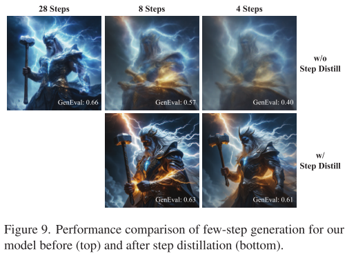 即使模型很小,如果需要50步推理也不够快。SnapGen采用扩散-GAN混合训练,将推理步数压缩到4-8步: