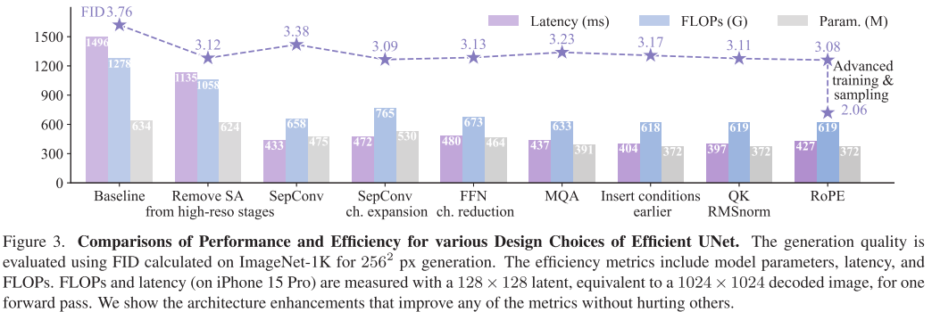 战略性移除自注意力: 在高分辨率阶段去掉自注意力层,只在最低分辨率保留。这一招不仅减少17%计算量,还意外提升了性能(FID从3.76降至3.12)