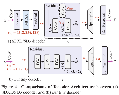 解码器往往是被忽视的性能瓶颈。SnapGen设计的解码器只有1.38M参数(SD3是49.5M),关键改进包括:
