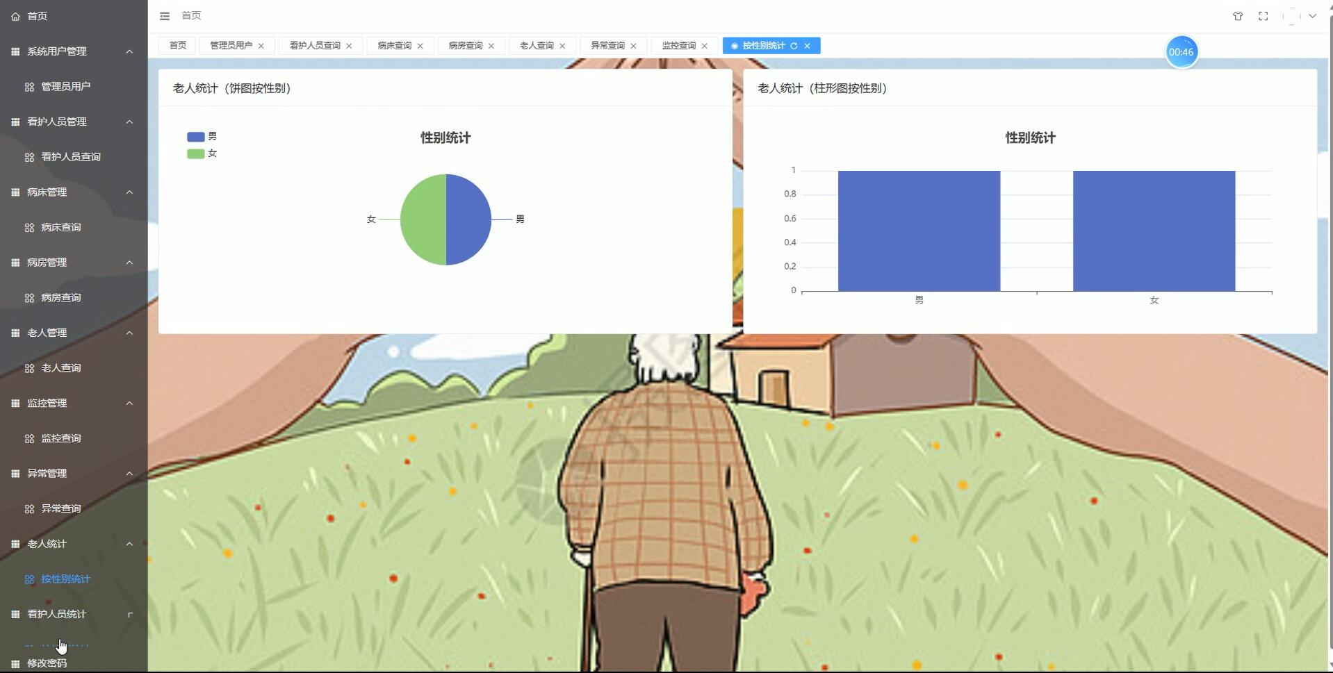 统计报表模块:对老人数量、病床使用率、异常事件发生频率等数据进行统计和分析,生成相应的报表。