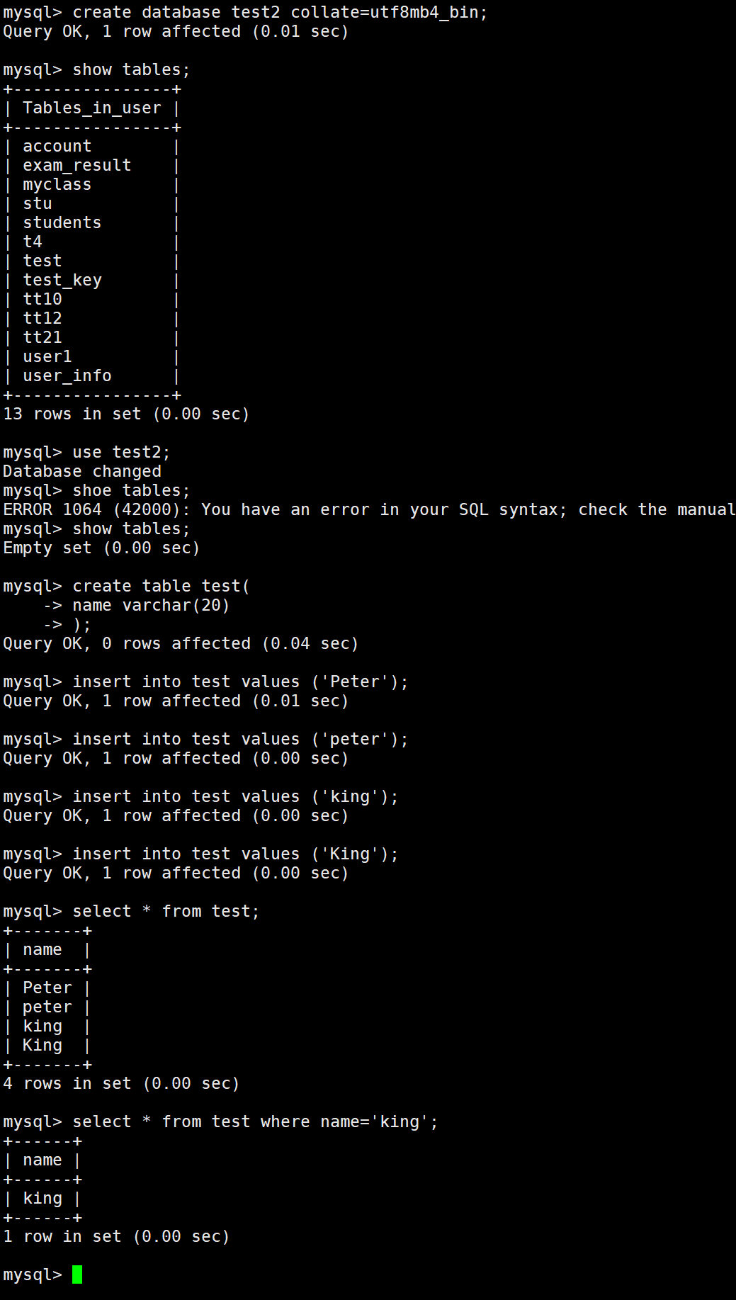 这里我们仿照上面的实验思路,只查出了'king',而没有查出'King',这里就说明utf8mb4_bin校验规则在对比数据时则区分大小写。