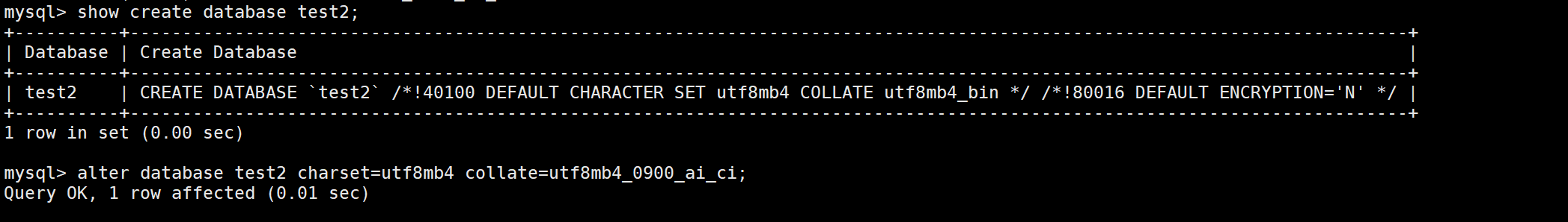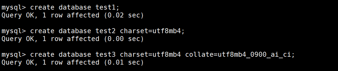 注意: 如果创建数据库时未指明数据库的编码格式或校验规则,则默认使用MySQL配置文件中对应的编码格式或校验规则。