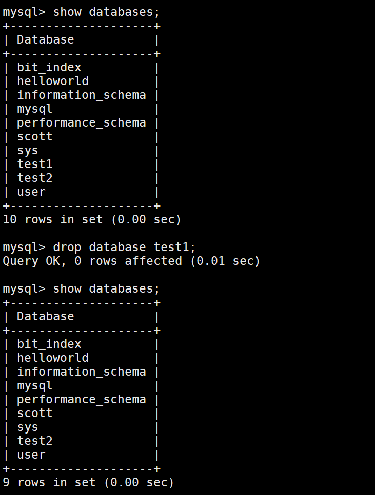 删除数据库后,该数据库下的所有表也都会被级联删除,所以在实际工作场景中,删除数据库一定要慎重!