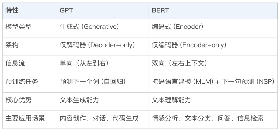 虽然这俩都是NLP领域的两大基石模型,虽然都基于Transformer架构,但在核心设计、训练方式和应用场景上存在根本区别,一个擅长生成内容,一个擅长理解内容。