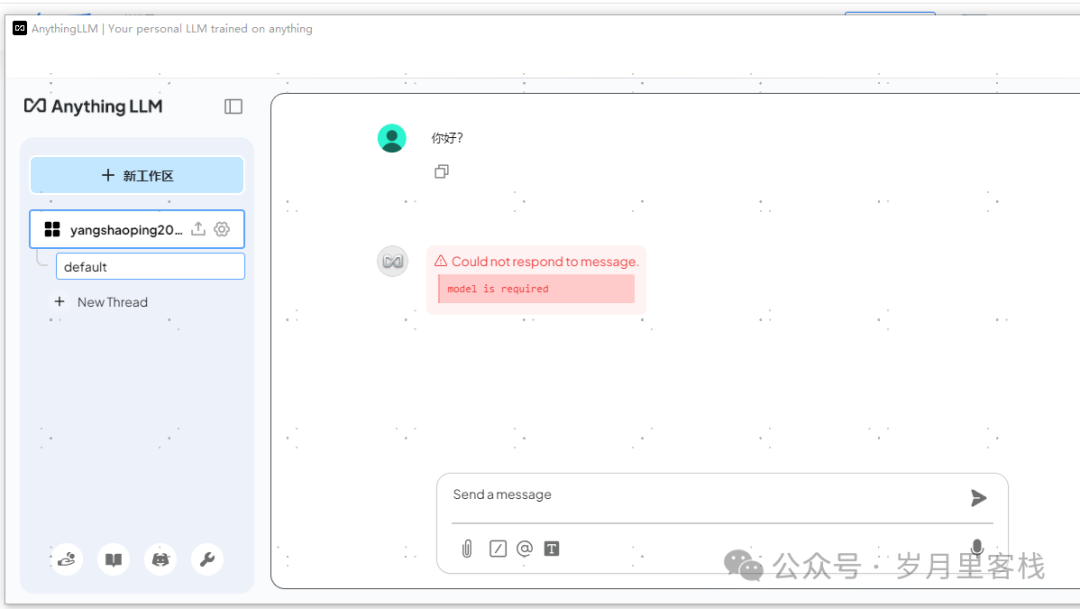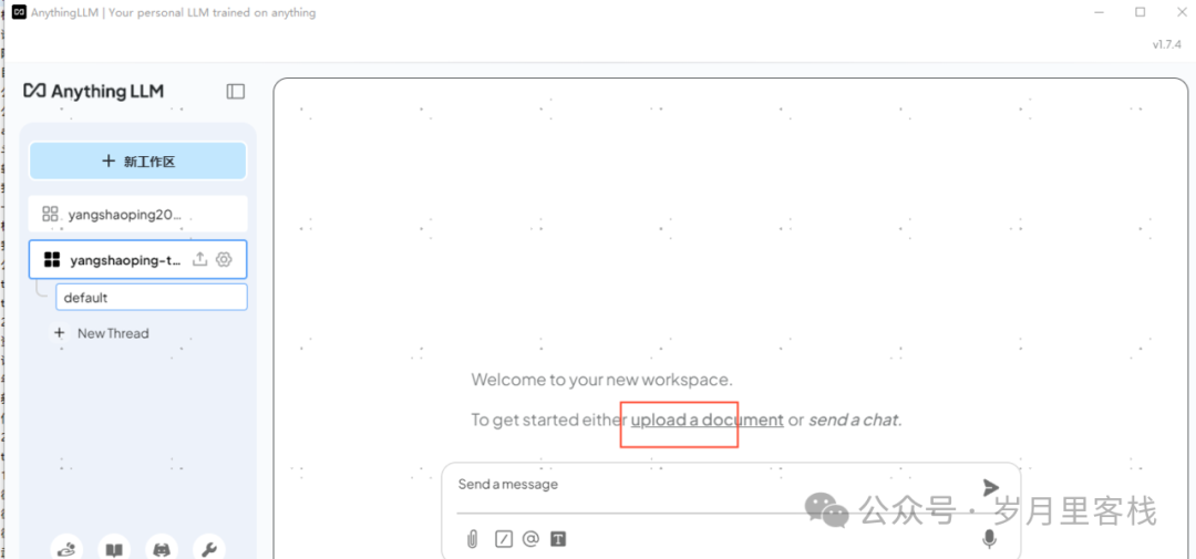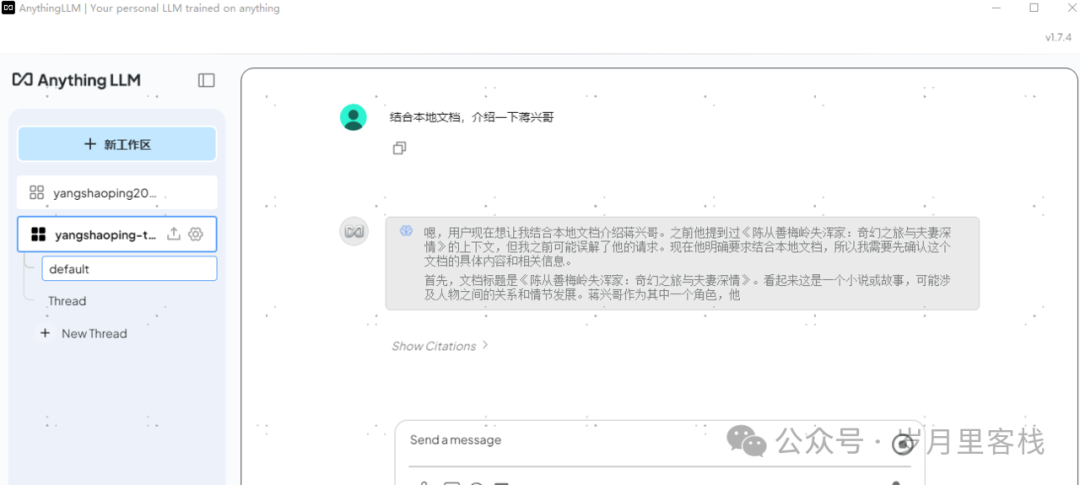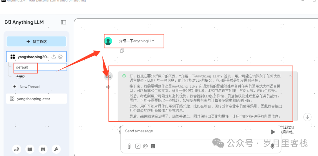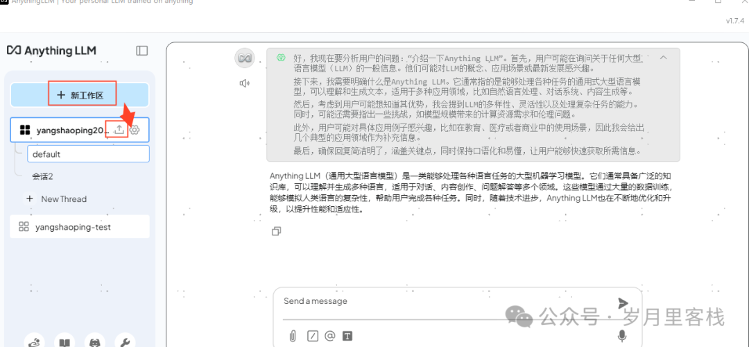 在聊天界面中,用户可以创建多个工作区。每个工作区可以独立管理文档和 LLM 设置,并支持多个会话(Thread),每个会话的上下文也是独立的。