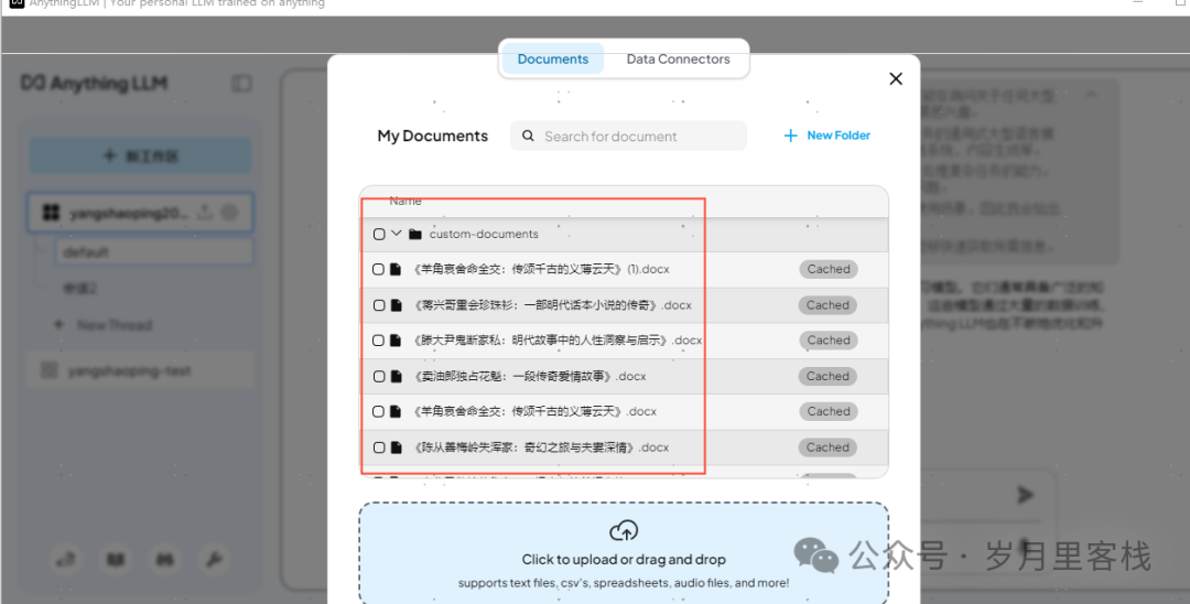 - 上传文档:将需要纳入知识库的文档(如 PDF、TXT、DOCX 等)上传到工作区中