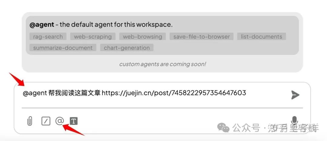 AnythingLLM 支持 AI 代理功能,用户可以通过 Agent 完成特定任务。除了官方提供的默认 Agent(如 Scrape websites),还支持通过社区添加自定义 Agent。