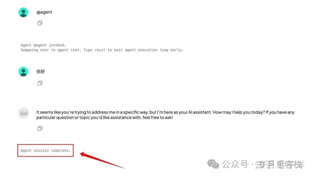 当会话提示 Agent session complete 时,表示已退出 Agent 会话。
