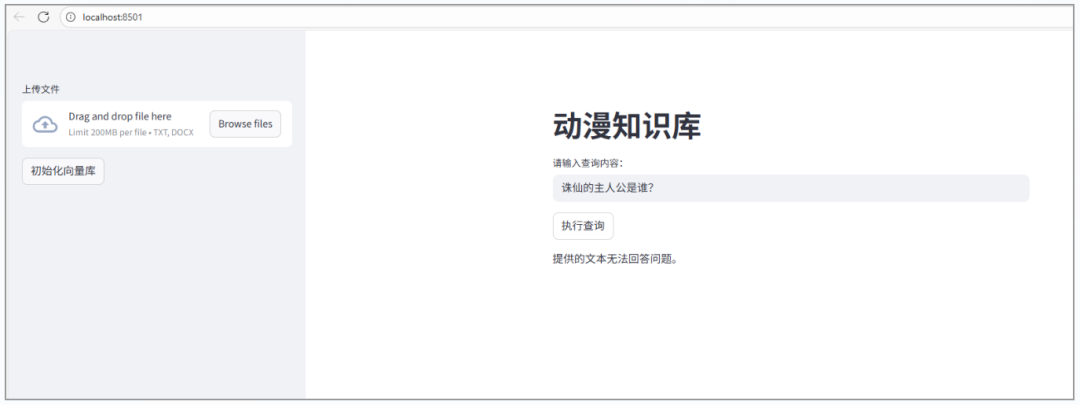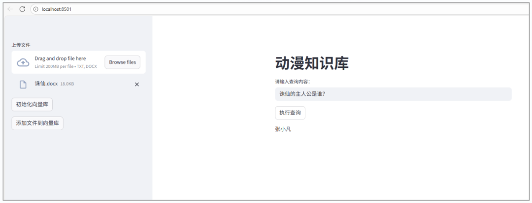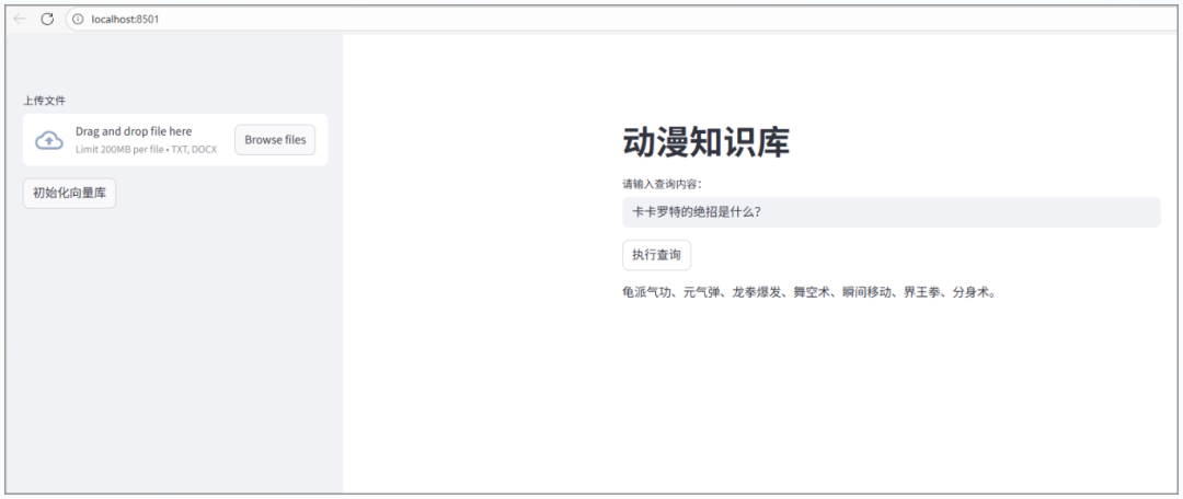 然后用Streamlit作为外部界面,构建一个可以查询和增加文档的小应用,也可以对向量库进行初始化,初始化的时候,系统会自动构建动漫龙珠的向量库,后续可以上传文档并添加新的知识。