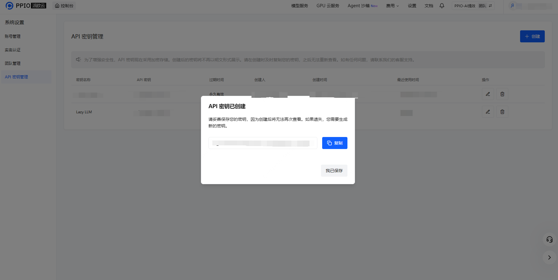 !!注意:密钥在服务端是加密存储,创建后无法再次查看,请妥善保存好密钥;若遗失需要在控制台上删除并创建一个新的密钥。