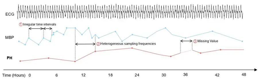 然而,在真实医疗场景中,尤其是重症监护室_(ICU)_,生命体征的记录往往呈现出“时疏时密”的特点:心跳以秒为单位波动,血压可能以小时为单位记录,而血液检测指标可能需要一天甚至更长时间才能更新一次。